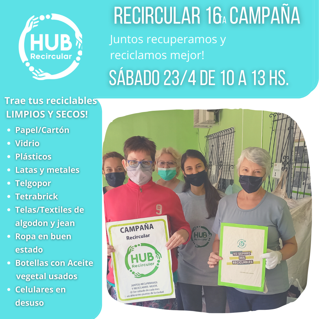 El próximo Sábado 23 de Abril los esperamos de 10 a 13 hs en una nueva Campaña Recircular, te invitamos a que juntos recuperemos y reciclemos mejor💪