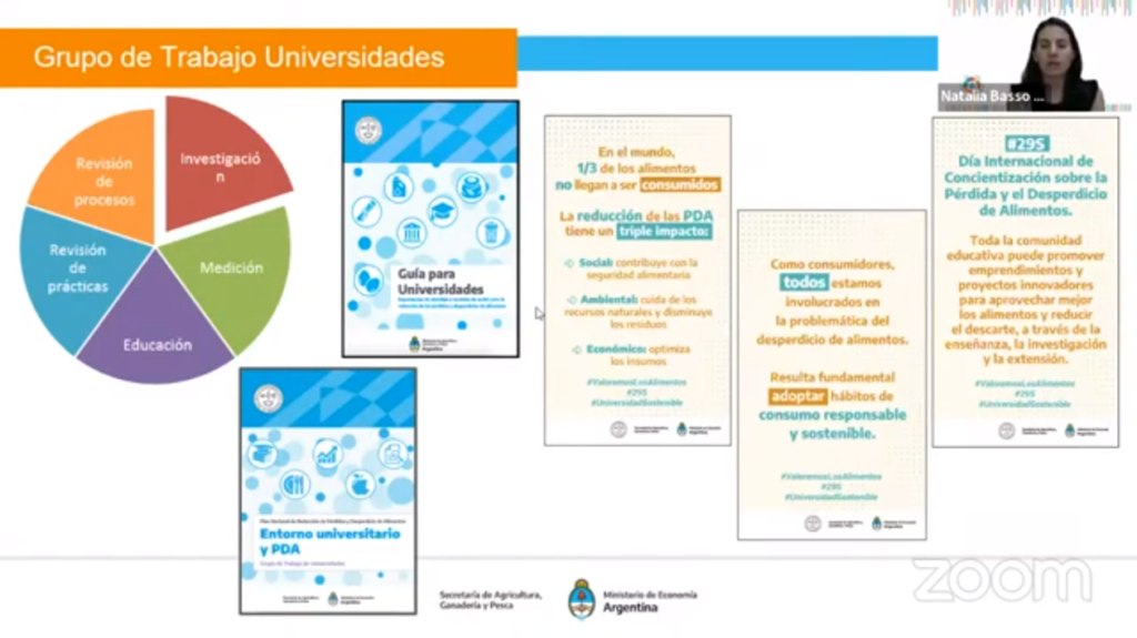 Por último, pero no por eso menos importante, se menciona el grupo de trabajo de universidades, vienen trabajando desde el año 2019, cuentan también una guía y se realizó una encuesta para saber cuánto conocimiento posee sobre el desperdicio de alimentos en el entorno universitario. Además, este año se realizó una campaña sobre el 29 de septiembre ya que es el día internacional de la concientización sobre la pérdida y el desperdicio de alimentos.