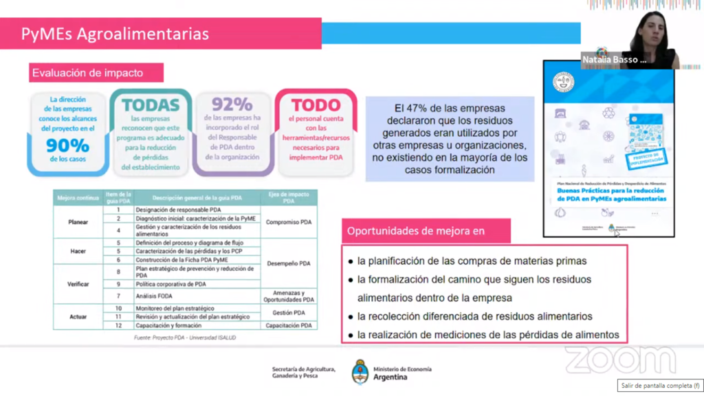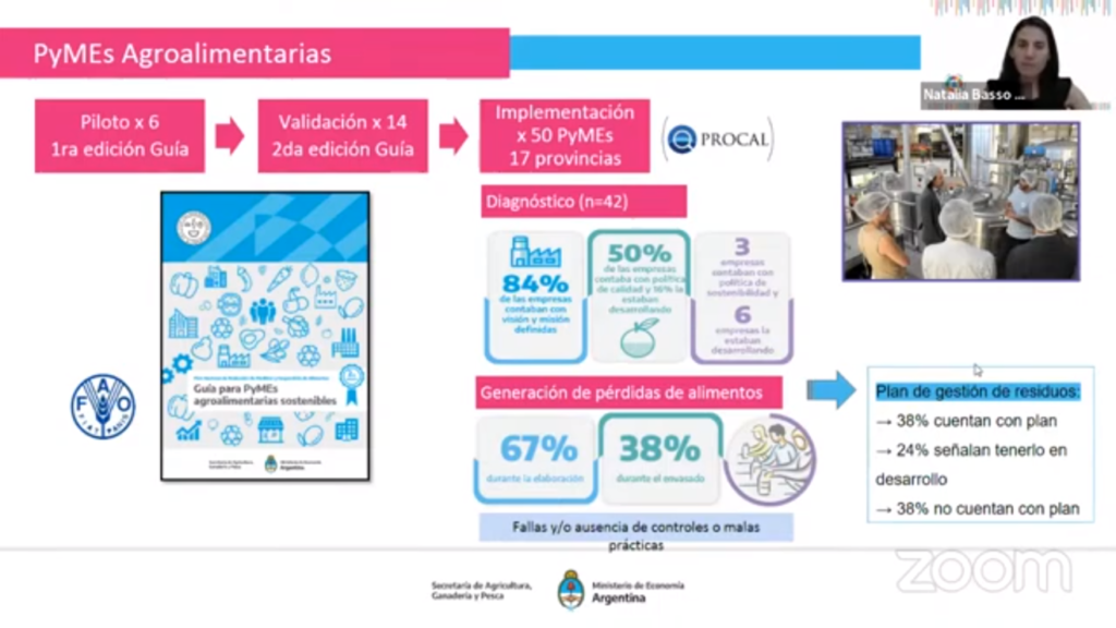 Se realizó una prueba piloto con 6 PyMEs que sirvió para realizar una guía para ellas sobre pérdidas y desperdicios de alimentos, luego se validó para 14 empresas y se sacó una segunda edición la cual se centró más en la gestión de calidad. Esta nueva guía se implementó en 50 PyMEs en 17 provincias. Esto fue financiado por el PROCAL y las PyMEs elegidas se podían anotar y luego eran elegidas en base a ciertos criterios.