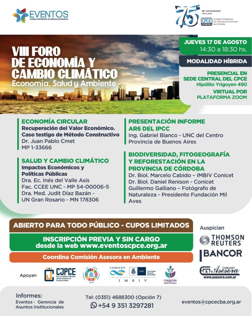VIII Foro de Economía y Cambio Climático Economía, Salud y Ambiente 17 de Agosto 2023, de 14:30 a 18:30, tanto presencial como virtual Nuestra Fundación acompaña en la difusión del evento