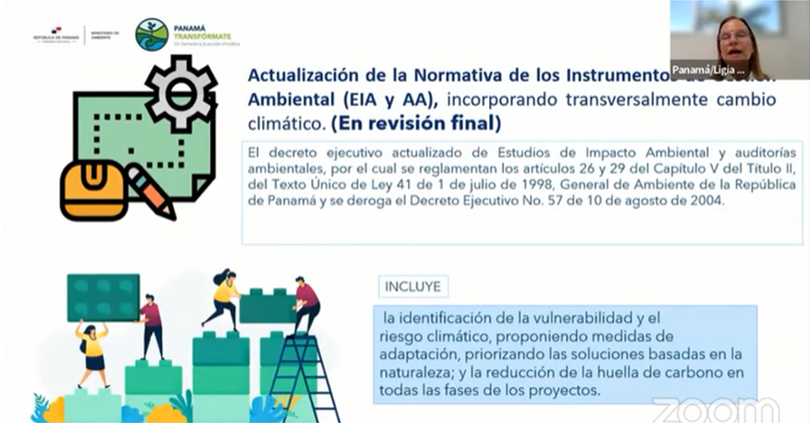 Se ha elaborado una guía técnica de cambio climático para proyectos de inversión pública. Esta guía contiene criterios que incorporen las medidas de mitigación y adaptación al cambio climático. Sumamente importante para construir los proyectos desde la sustentabilidad y basadas en Naturaleza. Luego de haber validado, mediante estudios científicos, que Panamá es Carbono Negativo, se planteó el reto de continuar siéndolo hacia el año 2050, lo cual significa un reto muy grande y trabajo conjunto entre las organizaciones públicas y privadas